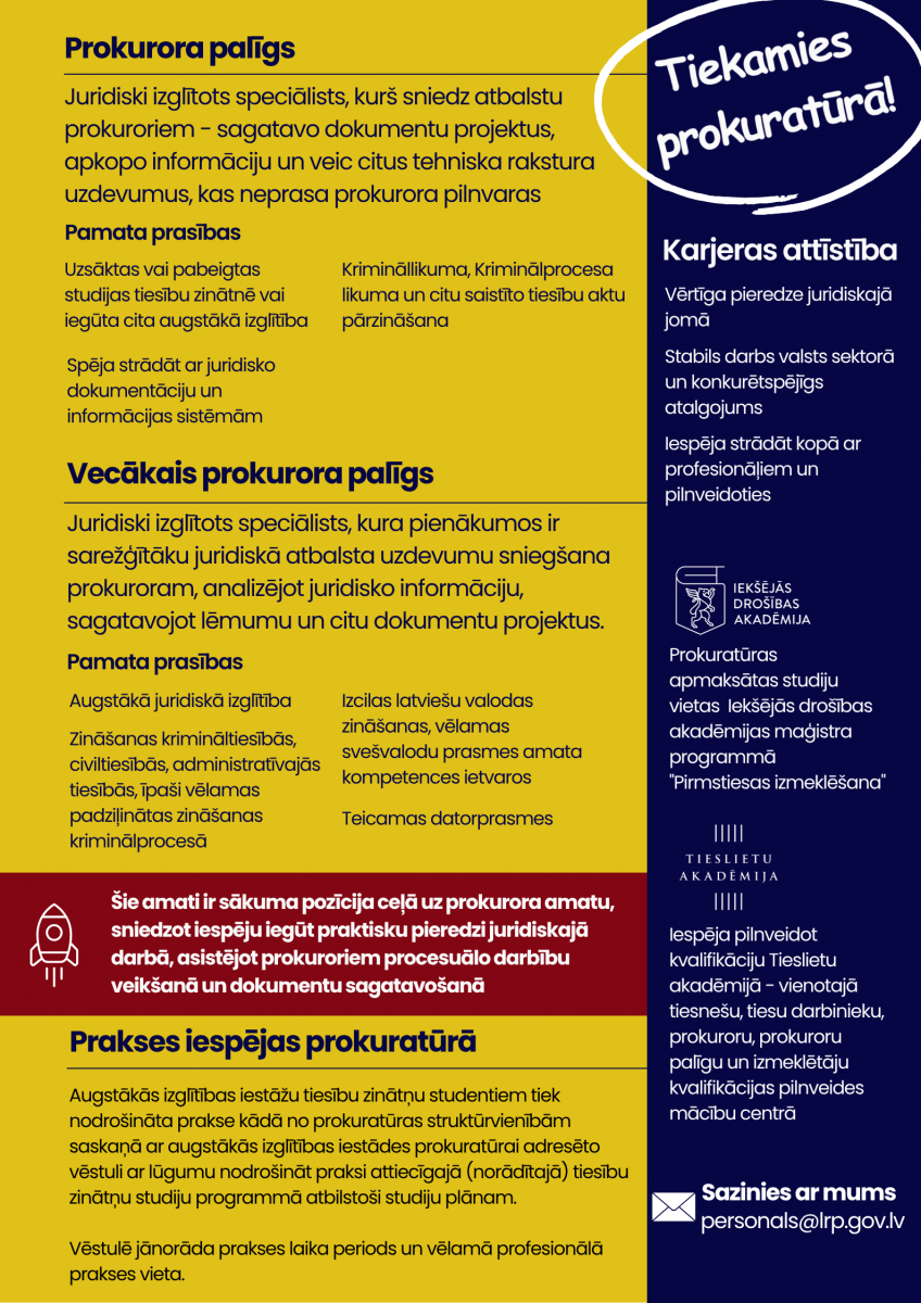 - Vēlamas zināšanas krimināltiesību un kriminālprocesuālo tiesību jomā, kā arī zināšanas civiltiesību un civilprocesa tiesību, administratīvā procesa un administratīvās atbildības jomā.