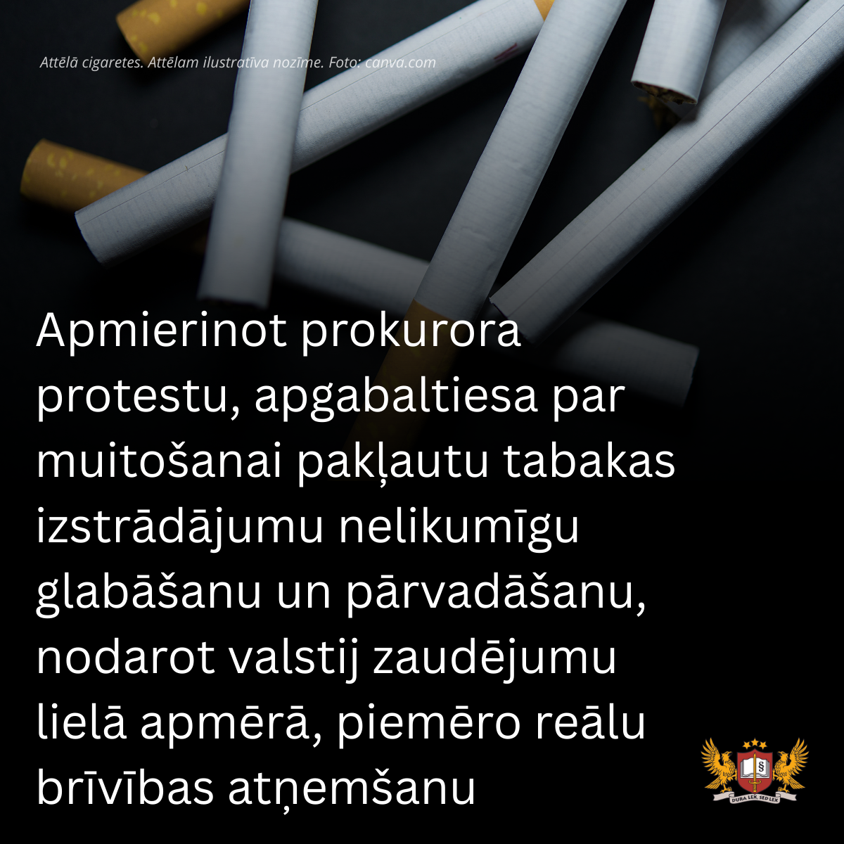 Apmierinot prokurora protestu, apgabaltiesa par muitošanai pakļautu tabakas izstrādājumu nelikumīgu glabāšanu un pārvadāšanu, nodarot valstij zaudējumu lielā apmērā, piemēro reālu brīvības atņemšanu