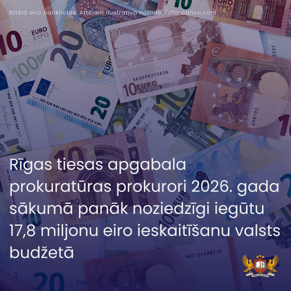 Rīgas tiesas apgabala prokuratūras prokurori 2026. gada sākumā panāk noziedzīgi iegūtu 17,8 miljonu eiro ieskaitīšanu valsts budžetā