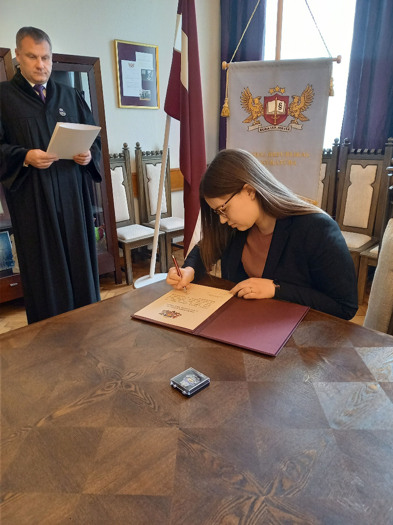 Sveikt Unu Gabriēlu Zelču-Vuškāni ar stāšanos prokurores amatā bija ieradusies arī viņas stažēšanās vadītāja, Rietumzemgales prokuratūras prokurore Zane Daibe.