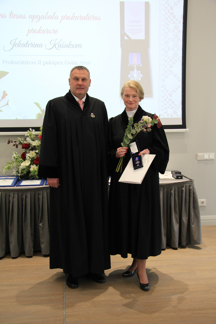 II pakāpes Goda zīme par nozīmīgu ieguldījumu prokuratūras attīstībā, demokrātijas un tiesiskuma stiprināšanā piešķirta Rīgas tiesas apgabala prokuratūras prokurorei Jekaterinai Kušakovai.