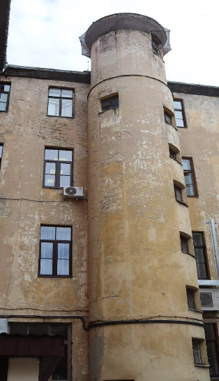 | Kāpņu telpas sienu gleznojuma atsegums | Ēkas ārskata būvapjoms, kurā bija izvietotas vītņu kāpnes, vēlāk lifts, bet šobrīd šahta netiek izmantota |