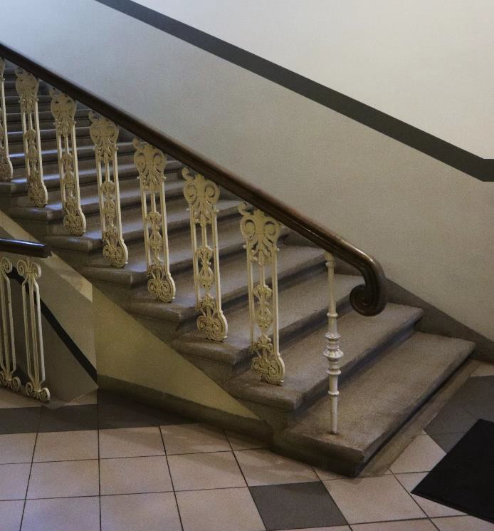 Ēkā izvietotas divas galvenās kāpņu telpas, divas “melnās” kāpņu telpas un esošs ēkas būvapjoms, kur vēsturiski bijušas vītņu kāpnes un vēlāk izbūvēts lifts, bet šobrīd šahta netiek ekspluatēta. Esošās kāpnes atrodas to oriģinālajās kāpņu telpās, kas izbūvētas 19. gadsimta beigās.