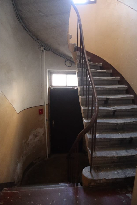 Bijušo vītņu kāpņu apjoms šobrīd netiek izmantots, veidojot šahtu, kas savieno visus ēkas stāvus. Telpai nav redzama sienu apdare. Durvju ailas aizmūrētas visos stāvos, atstājot vaļēju ailu vienīgi jumta stāvā. Kāpņu telpai ir aizmūrētas arī logailas. Pēc redzamajām pārsedzēm un ķieģeļu mūrējuma var secināt, ka jumta stāva logailas bijušas zemākas.