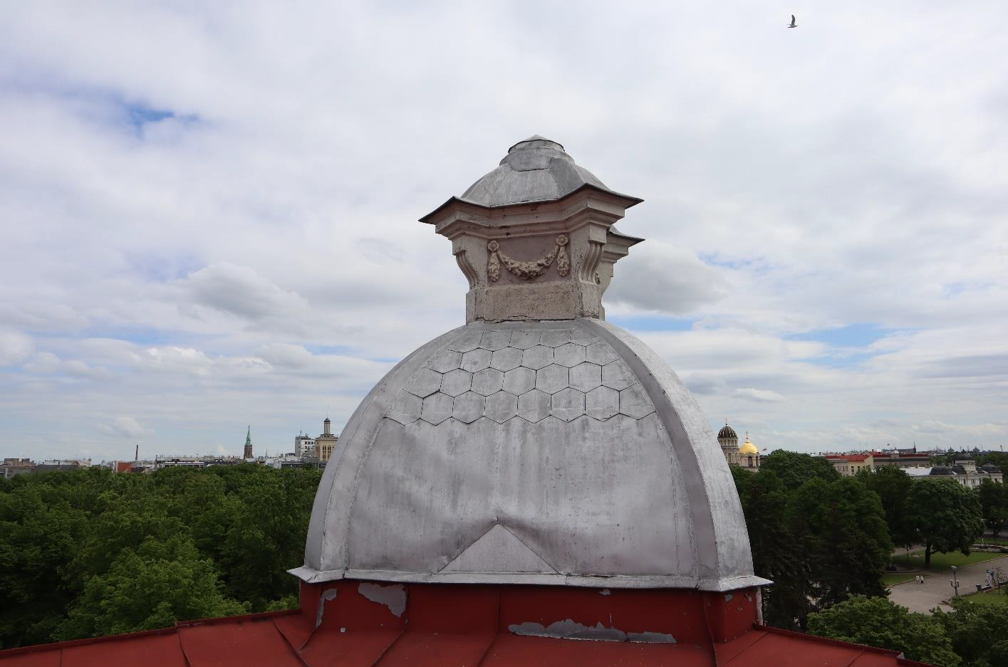 | Skats uz ēkas ielas fasādēm un erkeru. | Skats uz erkera torņveida izbūvi. | |