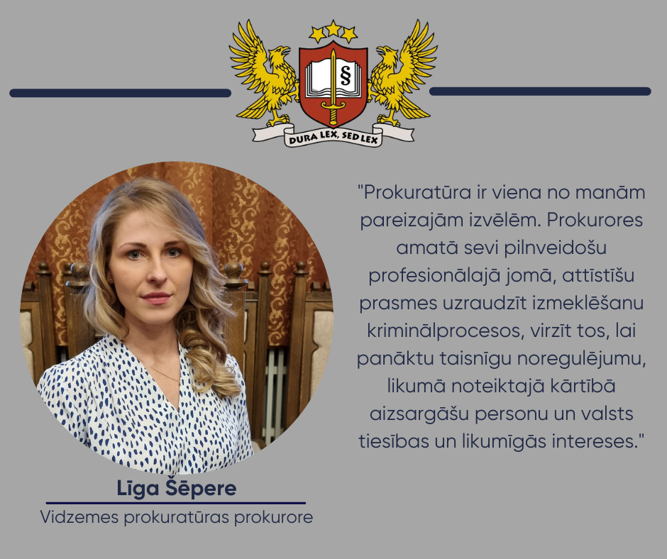 Taisnības cīnītājas gars Līgā ir jau kopš bērnības. “Kā daudzi bērni, bērnībā vēlējos kļūt par policisti. Pieaugot vēlmes bija mainījušās, plānoju iestāties Aizsardzības akadēmijā, tomēr liktenis bija lēmis citādi,” stāsta Līga. Viņa studēja tiesību zinātnes un studiju praksi aizvadīja Valsts policijā, kas pēcāk kļuva par viņas darba vietu. “Ar degsmi pildīju dienesta pienākumus, viss šķita interesants un saistošs, paralēli turpināju studēt un veidoju ģimeni. Sākot izmeklēšanu kriminālprocesos, veidojās tieša saskarsme ar prokuroriem, tolaik Centra rajona prokuratūrā. Ļoti spilgti atmiņā palika prokurore Līga Īzaka, kas tolaik bija jaunā prokurore, – laipna, tomēr prasīga,” par dienesta gadiem Valsts policijā stāsta Līga. Gūtā pozitīvā pieredze sadarbībā ar prokuroriem raisīja Līgā pieaugošu patiku pret prokurora profesiju un tika pieņemts lēmums karjeru attīstīt šai virzienā. “Nolēmu, ka virzīšos lēnām, pakāpeniski apgūstot gan praktiskās, gan teorētiskās zināšanas un iemaņas. Man bija būtiski izprast visu kriminālprocesa gaitu, sākot jau no iesnieguma saņemšanas. 2022. gada pavasarī nolēmu pieteikties uz prokurora amatu, jutos un aizvien jūtos droša par sevi un savām spējām,” savu apņēmību un gatavību šim amatam pauž prokurore.