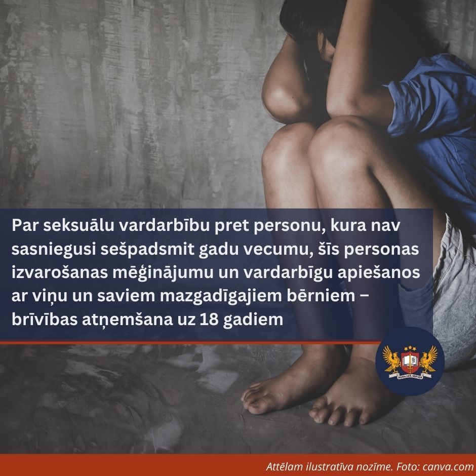 Par seksuālu vardarbību pret personu, kura nav sasniegusi sešpadsmit gadu vecumu, šīs personas izvarošanas mēģinājumu un vardarbīgu apiešanos ar viņu un saviem mazgadīgajiem bērniem – brīvības atņemšana uz 18 gadiem