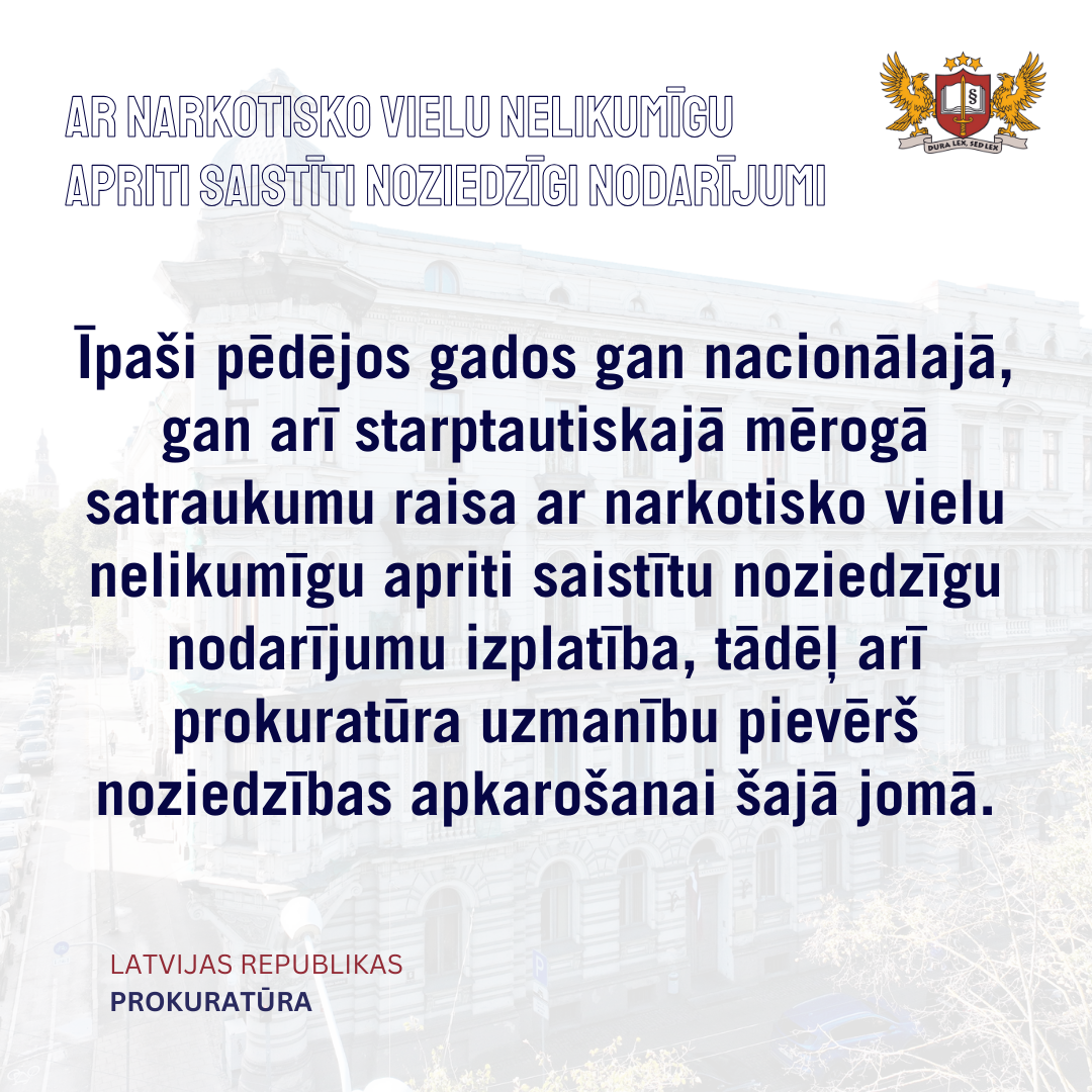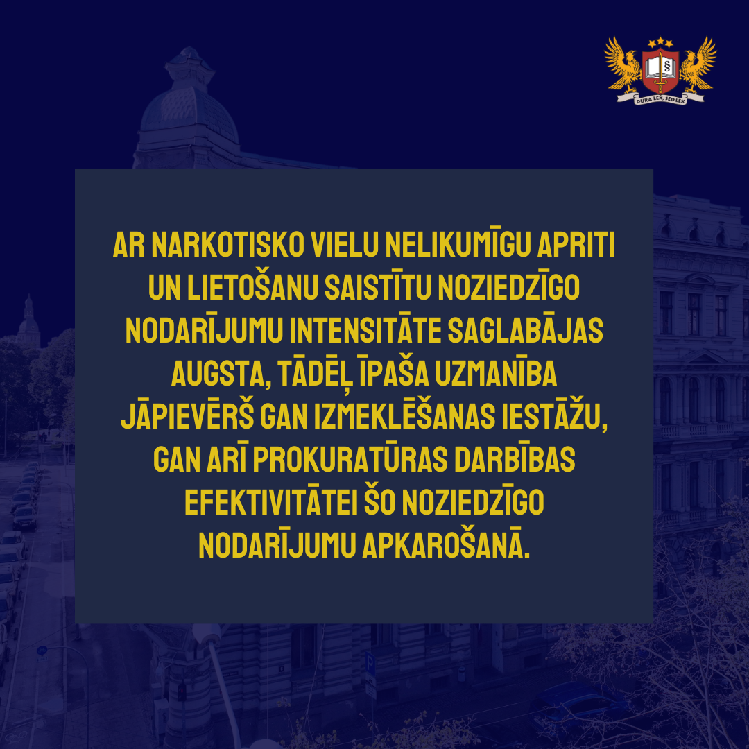 Īpaši pēdējos gados gan nacionālajā, gan arī starptautiskajā mērogā satraukumu raisa ar narkotisko vielu nelikumīgu apriti saistītu noziedzīgu nodarījumu izplatība, tādēļ arī prokuratūra uzmanību pievērš noziedzības apkarošanai šajā jomā.