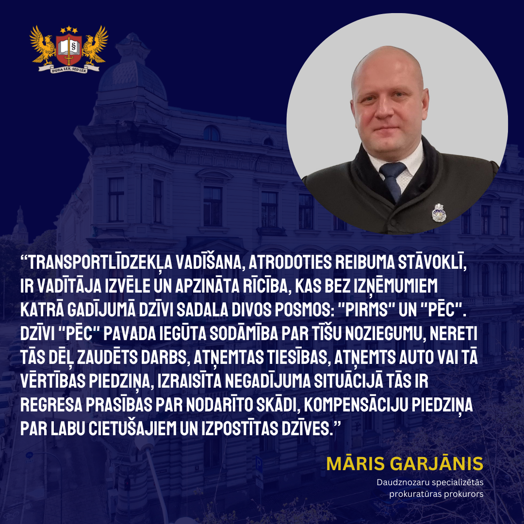 “Transportlīdzekļa vadīšana, atrodoties reibuma stāvoklī, ir vadītāja izvēle un apzināta rīcība, kas bez izņēmumiem katrā gadījumā dzīvi sadala divos posmos: "pirms" un "pēc". Dzīvi "pēc" pavada iegūta sodāmība par tīšu noziegumu, nereti tās dēļ zaudēts darbs, atņemtas tiesības, atņemts auto vai tā vērtības piedziņa, izraisīta negadījuma situācijā tās ir regresa prasības par nodarīto skādi, kompensāciju piedziņa par labu cietušajiem un izpostītas dzīves,” norāda Daudznozaru specializētās prokuratūras prokurors Māris Garjānis.