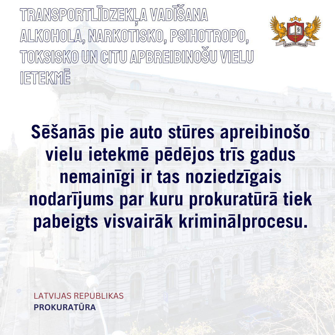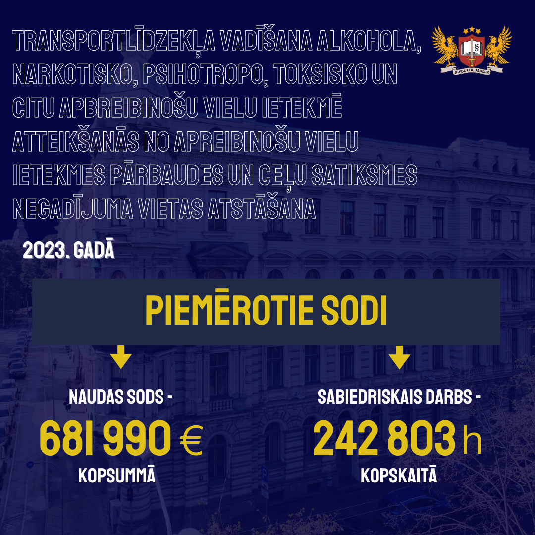 2023. gads bija pirmais gads, kad saskaņā ar grozījumiem Krimināllikumā (turpmāk – KL) par transportlīdzekļa vadīšanu alkohola ietekmē pie kriminālatbildības sauktas arī personas, kurām ir atbilstošas kategorijas transportlīdzekļa vadīšanas tiesības, ja viņu izelpotā gaisa vai asins pārbaudē konstatētā alkohola koncentrācija asinīs pārsniedz 1,5 promiles, par ko iepriekš bija paredzēta administratīvā atbildība. Minēto KL grozījumu ietekmē 2023. gadā ievērojami audzis tādu kriminālprocesu skaits, kuros apsūdzības celtas par transportlīdzekļa vadīšanu alkohola, narkotisko, psihotropo, toksisko un citu apbreibinošu vielu ietekmē. Vienlaikus tas arī ļauj izdarīt skumju secinājumu, ka bargāki sodi tomēr nav atturējuši cilvēkus no sēšanās pie auto stūres apreibinošu vielu ietekmē.