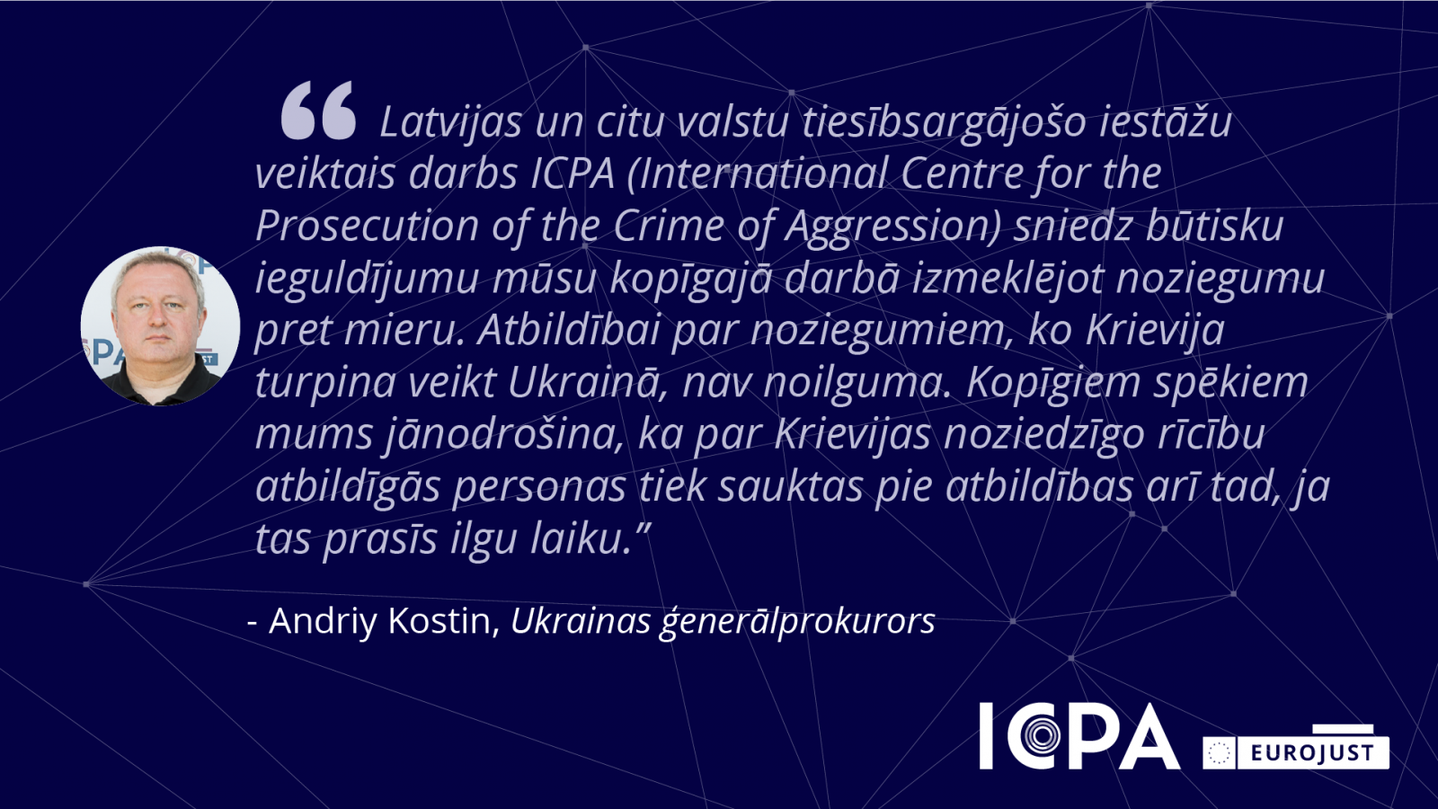 Ukrainas ģenerālprokurors Andrijs Kostins sacīja: ‘‘Latvijas un citu valstu tiesībsargājošo iestāžu veiktais darbs ICPA (International Centre for the Prosecution of the Crime of Aggression) sniedz būtisku ieguldījumu mūsu kopīgajā darbā izmeklējot noziegumu pret mieru. Jau no ICPA izveides brīža Latvijas tiesībaizsardzības iestāžu pārstāvji – Ģenerālprokuratūras prokurors un Valsts drošības dienesta izmeklētājs – pastāvīgi līdzdarbojas ICPA, vācot pierādījumus par Krievijas Federācijas veiktajiem agresijas noziegumiem Ukrainā.