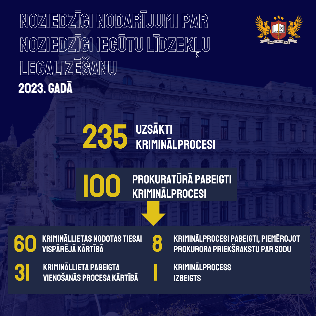 2023. gadā valstī kopā uzsākti 235 kriminālprocesi, kuros tiek izmeklēti noziedzīgi nodarījumi par noziedzīgi iegūtu līdzekļu legalizēšanu. Savukārt prokuratūrā 2023. gadā pabeigti 100 kriminālprocesi – 60 krimināllietas nodotas tiesai vispārējā kārtībā, 31 krimināllieta – vienošanās procesa kārtībā, 8 kriminālprocesi pabeigti, piemērojot prokurora priekšrakstu par sodu, bet 1 kriminālprocess izbeigts.