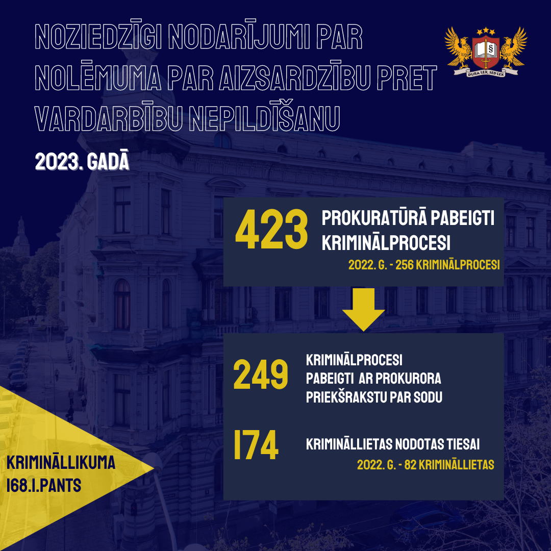 2023. gadā pēc Krimināllikuma 168.1 panta prokuratūrā pabeigti 423 kriminālprocesi (2022. gadā – 256), no tiem 249 ir pabeigti ar prokurora priekšrakstu par sodu, savukārt tiesai nodotas 174 krimināllietas, kas ir divas reizes vairāk nekā 2022. gadā (82 krimināllietas). Minētais norāda uz to, ka prokurori Krimināllikuma 168.1 pantā paredzēto noziedzīgo nodarījumu izdarījušai personai nav saskatījuši iemeslu un pamatu ar priekšrakstu par sodu piemērot viņai vieglāku sodu, t. i., tādu soda veidu, kas nepanāk visaugstāko efektivitāti.