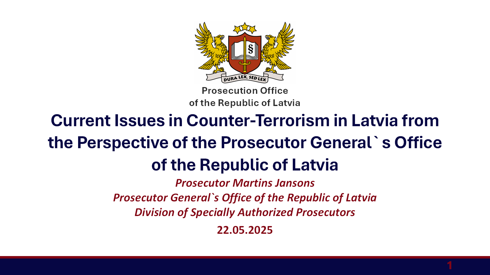 Mārtiņš Jansons uzstājās ar prezentāciju par aktuālajiem jautājumiem pretterorisma jomā Latvijā no Ģenerālprokuratūras perspektīvas (“Current Issues in Counter-Terrorism in Latvia from the Perspective of the Prosecutor General`s Office of the Republic of Latvia”). Prokurors sniedza ieskatu jautājumos saistībā ar terorisma riska novērtējumu, Valsts drošības dienesta un prokuratūras kompetenci šajā jomā gan kriminālprocesu ietvaros, gan veicot operatīvās darbības un pretizlūkošanas pasākumus. Tāpat prokurors Mārtiņš Jansons stāstīja par pasākumiem terorisma riska mazināšanas un prevencijas jomā, aktuālajiem ar terorismu saistītiem noziegumiem, to izmeklēšanu, kriminālvajāšanu un sasniegto rezultātu. Uzmanība tika vērsta arī uz izaicinājumiem, kas saistīti ar vēršanos pret kritisko infrastruktūru, tostarp saistībā ar zemūdens kabeļu bojāšanas Baltijas jūrā juridiskajiem aspektiem, universālo jurisdikciju un nākotnes perspektīvu šādu starpnacionālu noziegumu izmeklēšanā.
