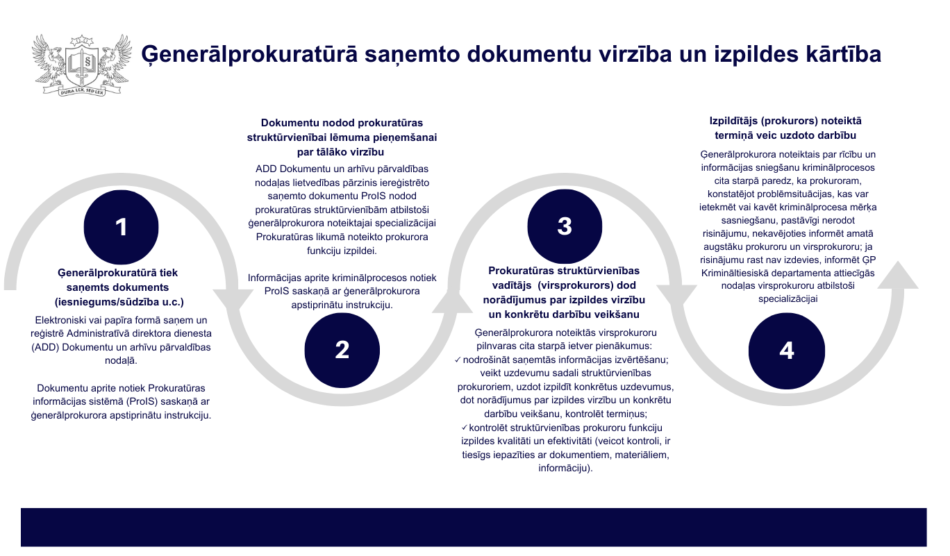Saskaņā ar Prokuratūras likuma 6.panta trešo daļu prokurora rīcība vai lēmums pārsūdzams procesuālajos likumos noteiktajos gadījumos un kārtībā (sūdzību iesniegšanu un izskatīšanu kriminālprocesā nosaka Kriminālprocesa likums). Sūdzības jautājumos, kas ir tikai prokuratūras kompetencē, iesniedzamas vienu līmeni augstākas prokuratūras struktūrvienības virsprokuroram, bet par Ģenerālprokuratūras prokurora rīcību vai lēmumu – ģenerālprokuroram. Šo amatpersonu pieņemtie lēmumi nav pārsūdzami.